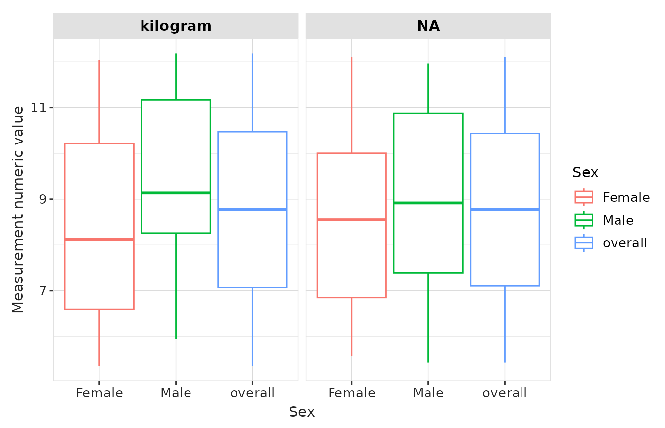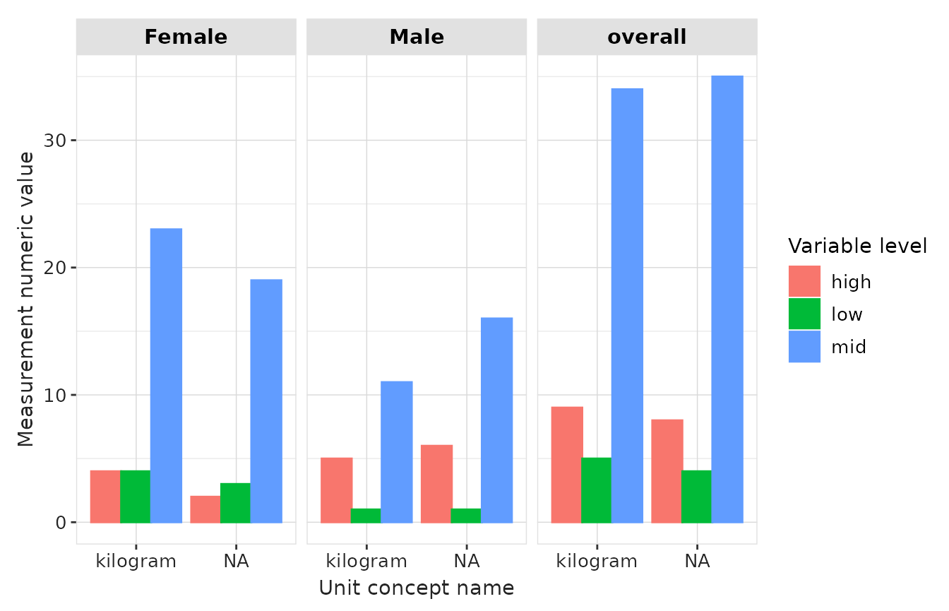 tableMeasurementSummary()— subjects with measurements, counts per subject, days between measurements.tableMeasurementValueAsNumber()— numeric value summaries (by unit where available).tableMeasurementValueAsConcept()— frequency of concept values.