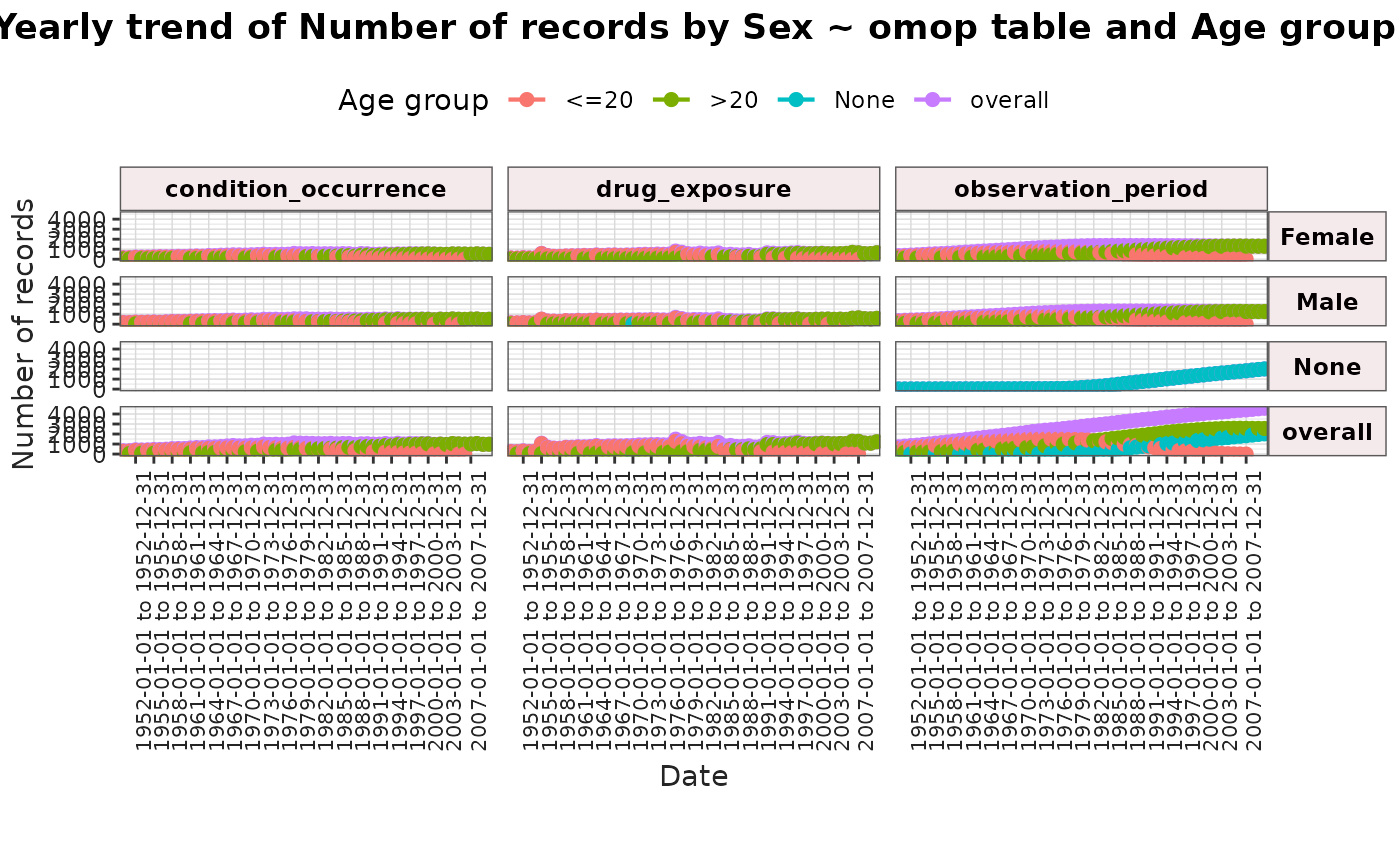 plotTrend(result = result, facet = sex ~ omop_table, colour = c("age_group"))