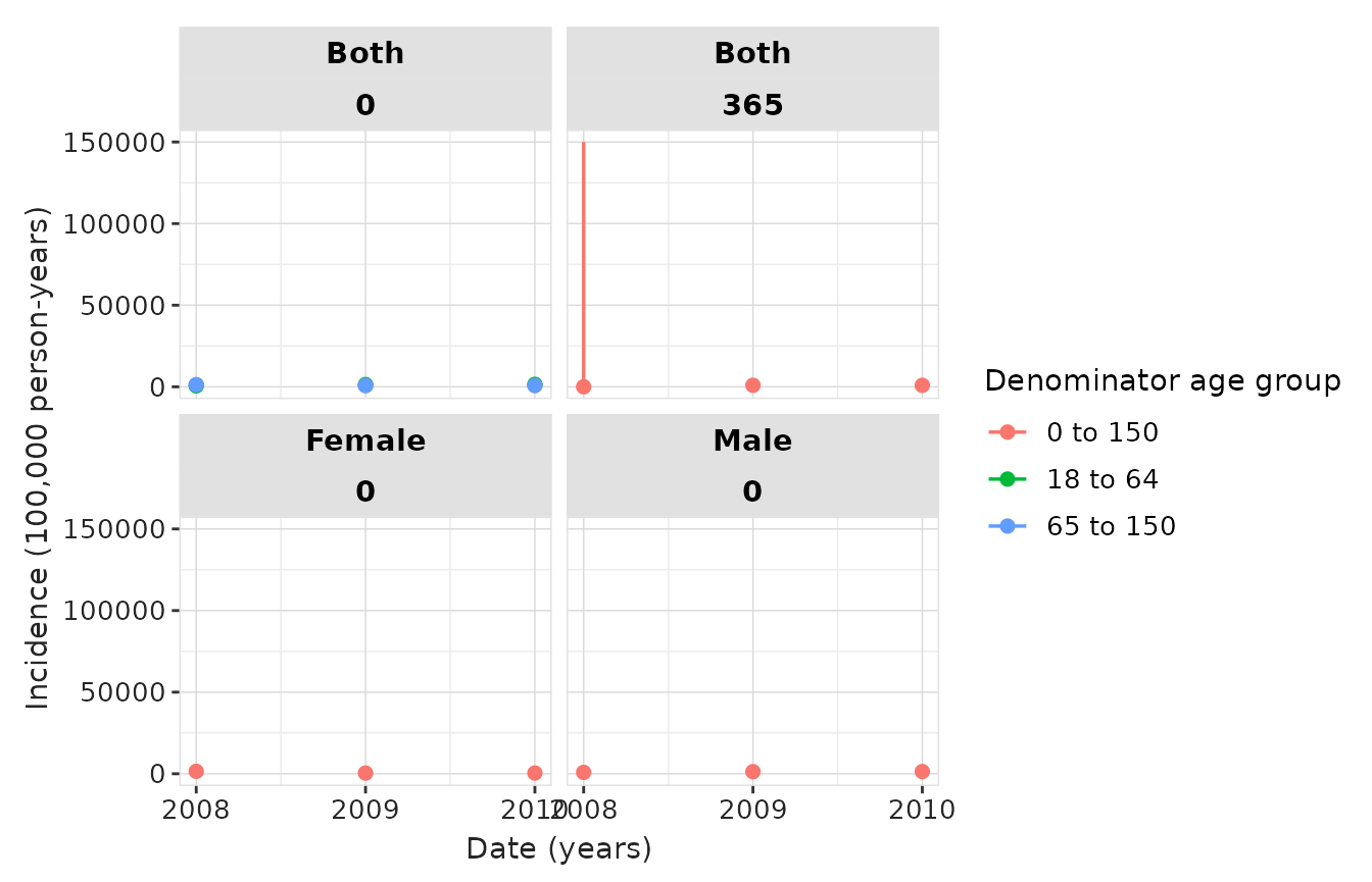 - Incidence: It estimates the incidence of our cohort using estimateIncidence().