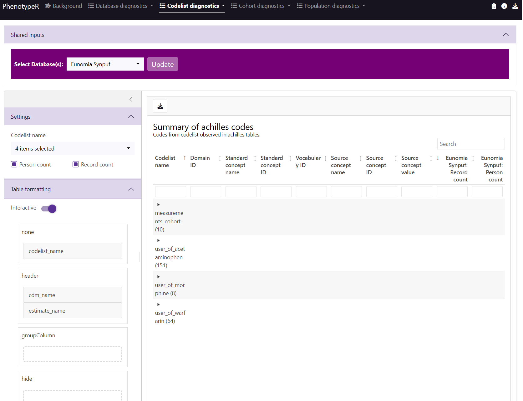 Let’s now explore additional functionalities that the ShinyDiagnostics offers. If we click to Codelist diagnostics / Achilles code use or Codelist diagnostics / Orphan code use tab, we will first find a horizontal purple bar that will show us all the databases we included: