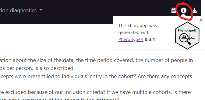 You can see which PhenotypeR version was used to generate the Shiny App by clicking the i tab at the top.