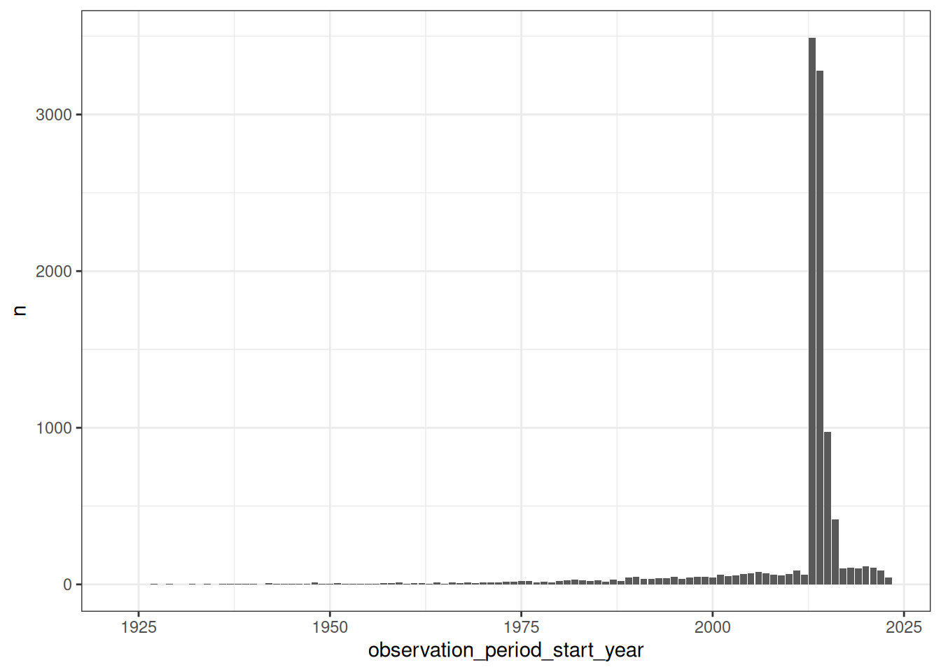 The OmopSketch R package aims to characterise and visualise an OMOP CDM instance to asses if it meets the necessary criteria to answer a specific clinical question and conduct a certain study. It can be very useful to conduct some of the analyses that we were conducting in the previous sections with bespoke code. For example, you can quickly summarise and visualise the observation period table as: