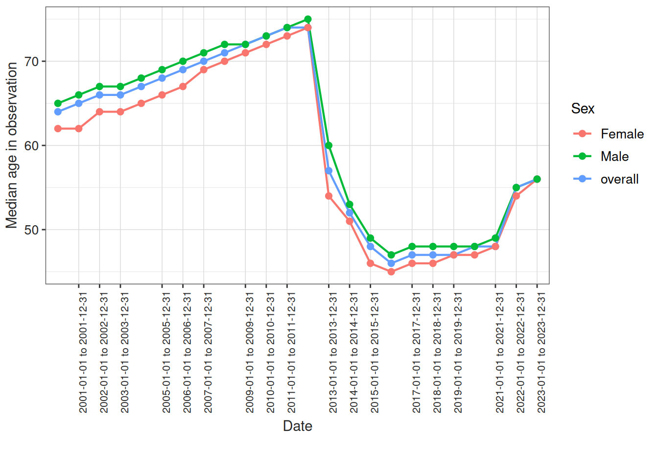 Or even the median age of the individuals in observation stratified by sex: