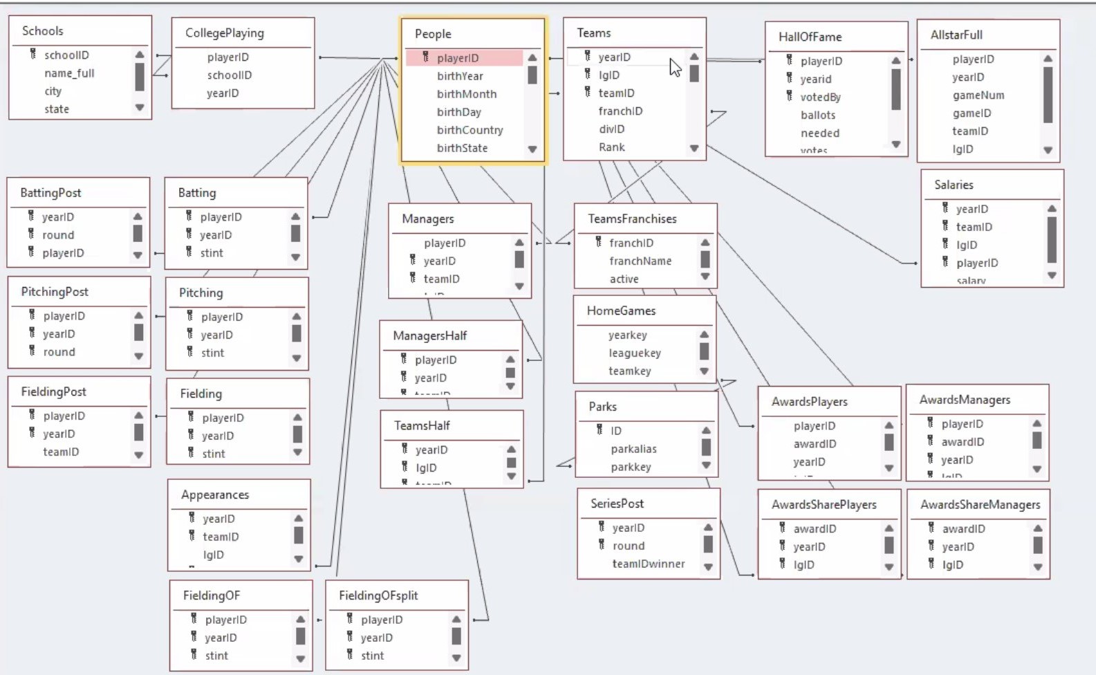 To see how we can develop a data model with associated methods and functions, we will use the Lahman baseball data. The data is stored across various related tables.